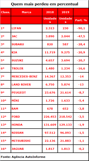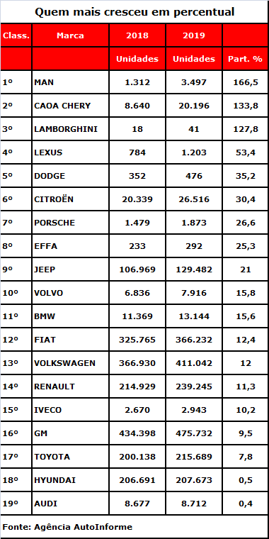 Entre as dez primeiras colocadas, apenas outras duas de grande volume: a Citroën, sexta que mais cresceu, com 26.516 unidades e aumento de 30%, e a Jeep, nona, com 129.482 carros e aumento de 21% em relação a 2018.