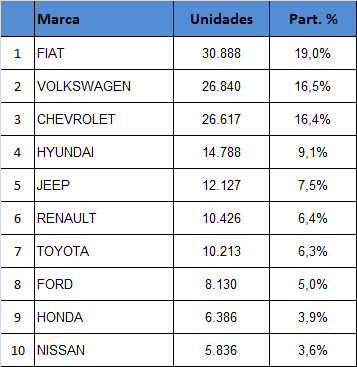 A Fiat começou o ano colocando 2,5 pontos percentuais em cima das suas principais concorrentes. A italiana vendeu 30.888 mil carros e ficou com 19% de participação, deixando Volkswagen (26.840 carros e 16,5%) e Chevrolet (26.617 e 16,4%) bem para trás. Mantendo o desempenho registrado em 2020, a Hyundai começa o ano destacando-se na quarta posição com 9,1% e a Jeep ficou em quinto lugar, numa inédita posição. A propósito, as marcas da Stellantis garantiram à montadora a liderança geral, com 28,1% das vendas internas e 45.644 unidades vendidas (veja quadro) e cinco carros da empresa ficaram entre os dez mais vendidos no mês.
