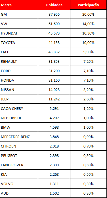 Muita gente considera mais importante a venda no varejo, aquela feita diretamente ao consumidor. E nesse setor, a participação da marcas é bem diferente do ranking das vendas totais. Embora as duas primeira posições permaneçam inalteradas, com GM em primeiro lugar e Volkswagen em segundo, daí pra frente aparecem a Hyundai, como terceira colocada no ranking do varejo e a Toyota em quarto.