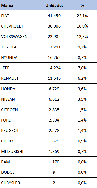 No ranking por marca, a Fiat segue na liderança, com 41.450 unidades e 22,1% de participação, seguida pela GM, com 16% do mercado e 30.008 carros. A Volkswagen continua em terceiro, vendeu 22.982 carros e ficou com 12,3% e a Toyota se mantém na quarta posição, com 17.291 e 9,2% de participação.