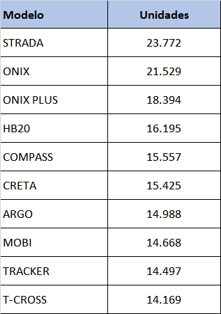 A Strada continua forte na liderança, seguida por Onix, Onix Plus, HB20 e Compass.