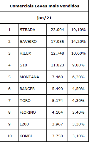 A segunda colocada é a Saveiro, com 17 mil unidades vendidas e em terceiro aparece a primeira picape média, a Toyota Hilux.