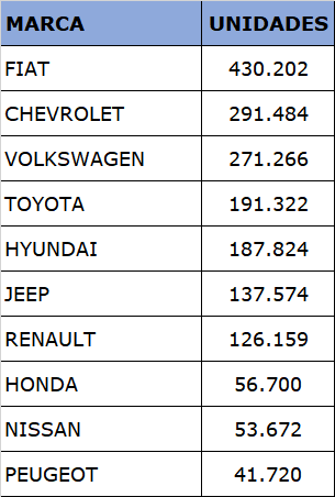A Fiat confirmou sua folgada liderança e fechou 2022 com 430,2 mil unidades vendidas, ou seja, a cada dez carros vendidos, dois foram da marca italiana. A GM ficou em segundo lugar, com 291.480 carros e a Volkswagen em terceiro com 271.265.