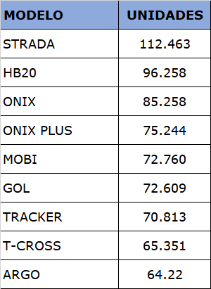 Como estava previsto, a Strada foi o modelo mais vendido no Brasil no ano, o único que passou das 100 mil unidades: foram 112.493 licenciamentos. O HB20 foi o segundo colocado, com 96.258 unidades, seguido por Onix (85.258) e Onix Plus 75.244.